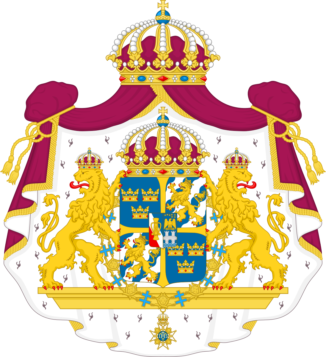 大国徽为王徽,二、四象限为带有三王冠的小国徽,一、三象限绘有比耶博王朝的纹徽,即蓝白斜纹相间的盾徽和红舌红爪戴金冠的金色忿怒状狮子。中间小盾分别绘有瓦萨王朝和贝尔纳多特王朝的徽号。上有王冠。外为六翼天使勋章,两只狮子,再覆以斗蓬和王国王冠。