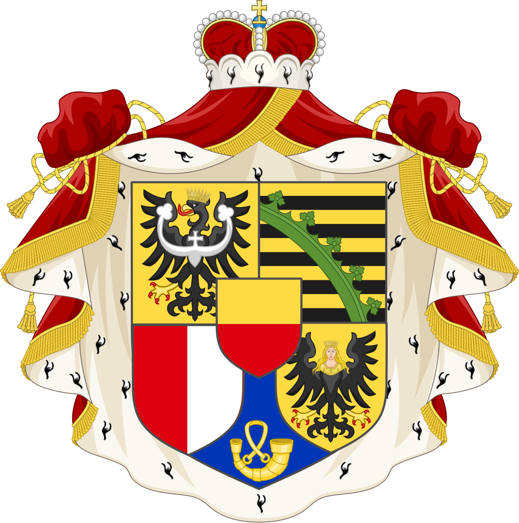 中央主体是盾牌,盾面由四部分组成。第一象限是金色背景上的黑色哈尔卑斯山羊角;第二象限是红白相间的长方形;第三象限是蓝色背景上的金色皇冠;第四象限是金色背景上的黑色哈尔卑斯山羊角。盾牌由两个金色的狮子支撑。盾牌上方装饰着王冠。底部飘带上写着格言。周围环绕着金色的麦穗。